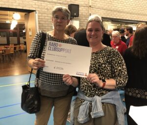 Ook dit jaar heeft de Rabo clubactie weer een heel aardig bedrag opgeleverd. Op de foto tonen Margot Theunisse en Trudie Kessels de cheque van 317,54 Euro.